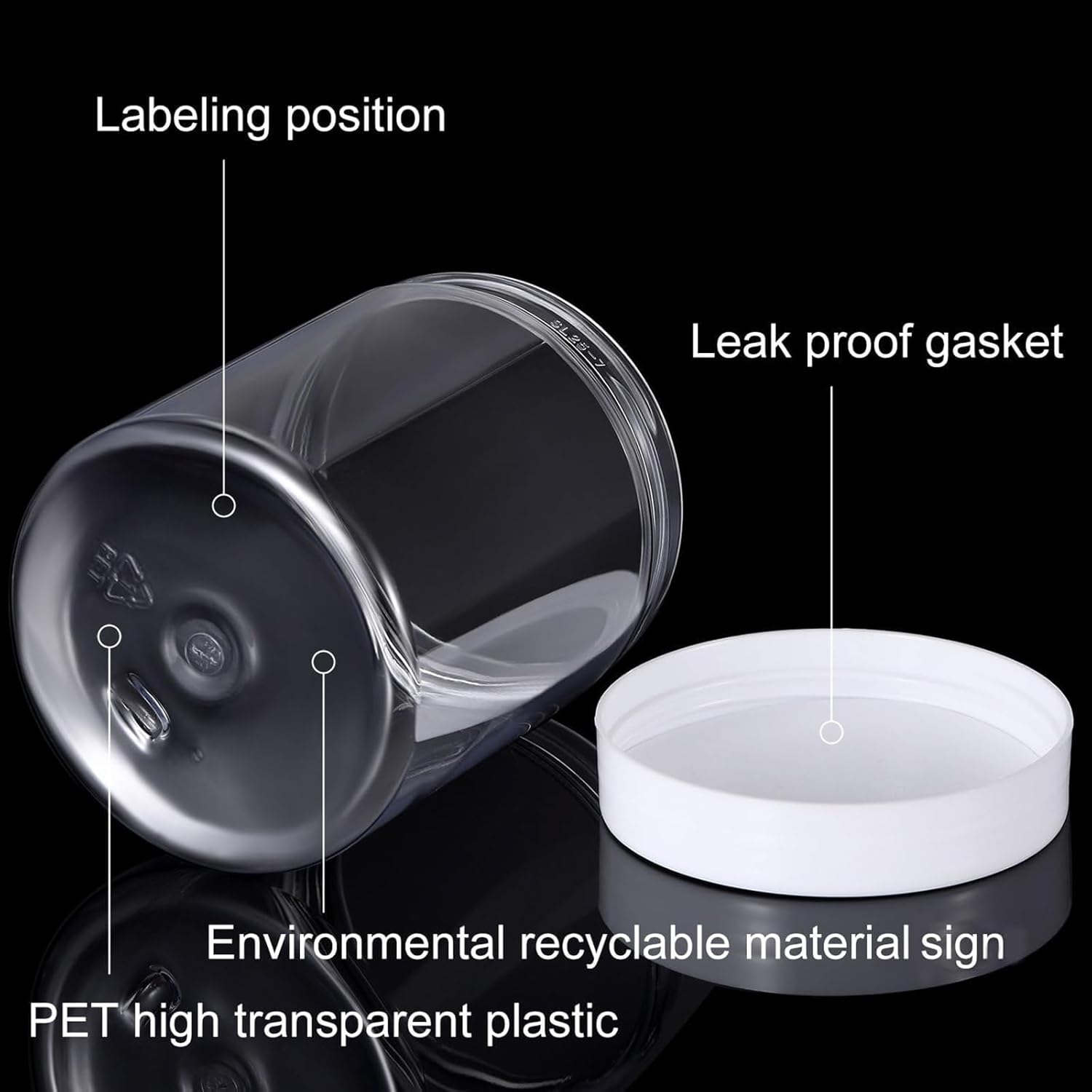 - Quality material: the 4 oz plastic jars with lids are made of quality clear plastic, without odd smell, does not contaminate your skincare products, stable, high temperature resistance, a black plastic cover with lid, sealed storage and leak proof