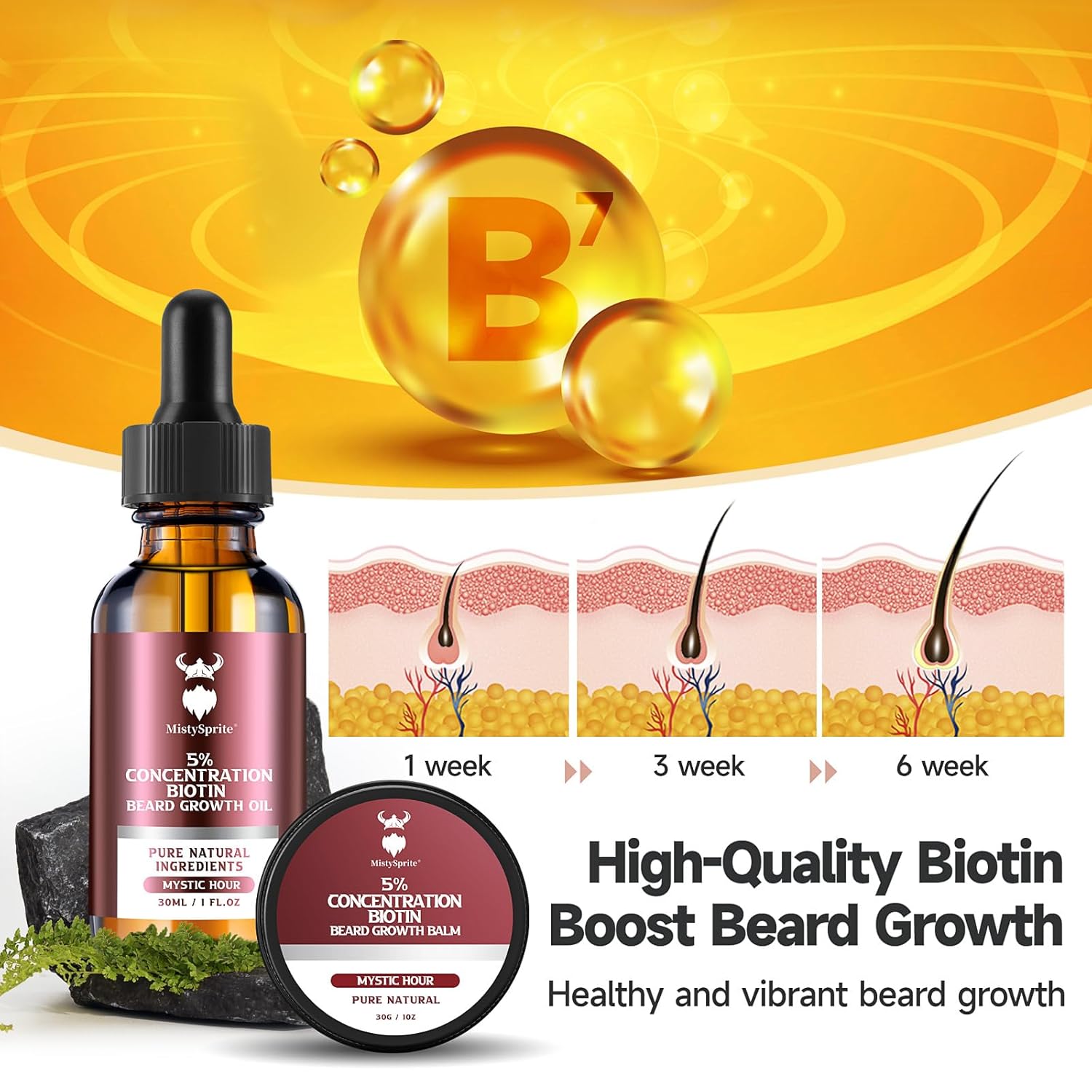 - 5% Concentration Biotin Releases Beard Growth Vitality: MistySprite beard oil for men biotin is one of the key ingredients, which is essential for revitalizing hair follicles and promoting beard growth. It strengthens your mustache, reduces breakage, makes it thicker, leaving you with healthier, more vibrant mustache