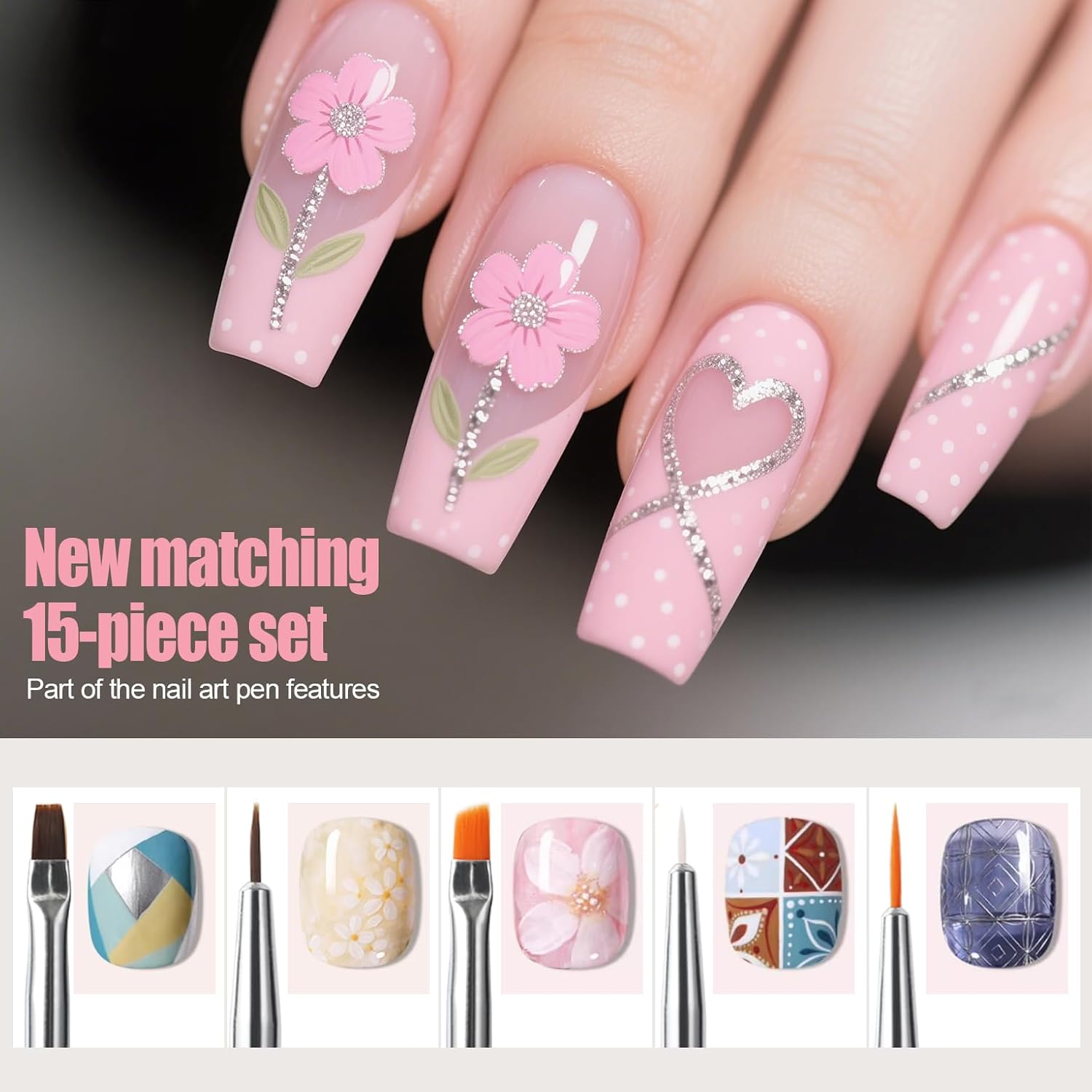 Artdone 15pcs Pink Nail Art Brushes, Nail Art Tool Set, Dotting Tools, Dust Brush,Striping Brushes for Long Lines, Drawing Pen For Gel Polish Design supply