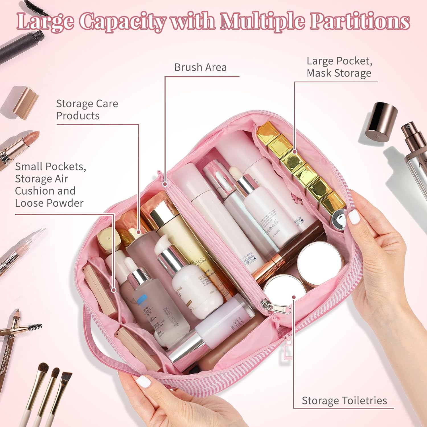 Travel Makeup Bag for Women, 2Pcs Portable Personalized Initial Makeup Organizer Bag, Open Flat Large Cosmetic Bag With Travel Essential Pouch (Pink Letter W)