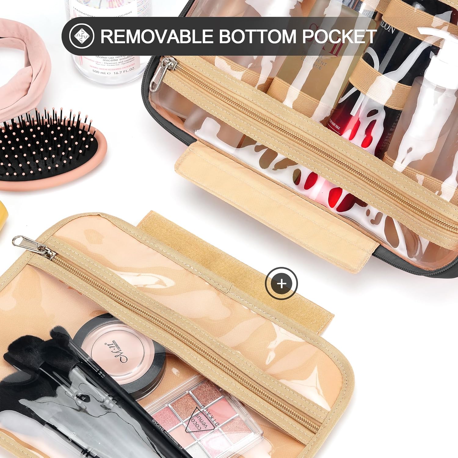 - CONSIDERABLE DESIGN - The elastic bands inside the two main compartments can keep the different height bottles fixed and upright. Your comb, toothbrush, razor, and leak-prone makeup can all go in there, even a hair dryer. 360° metal hook gives you a variety of hanging options.