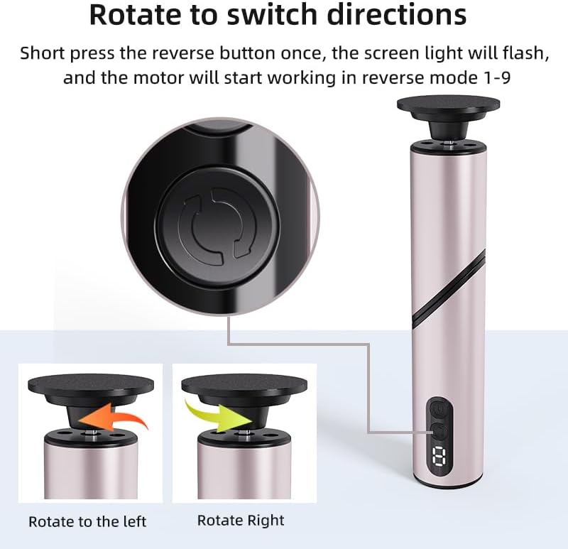 - Rechargeable Cordless Design: Unlike traditional corded electric callus remover for feet, this one is completely wireless design. Convenient and flexible to use in different scenarios. Equipped with a high-capacity 1800mAh battery that supports up to 3 hours use. It also has a one-touch reversing function that makes it easy to switch the direction of grinding.